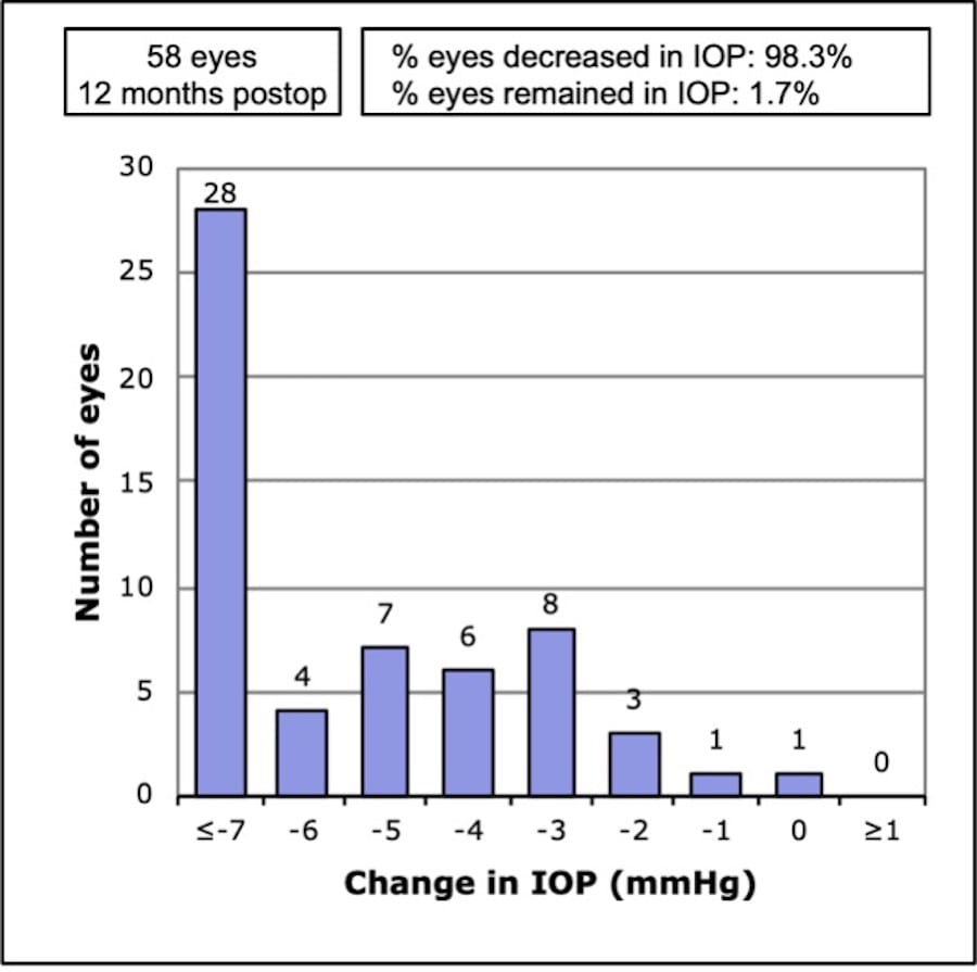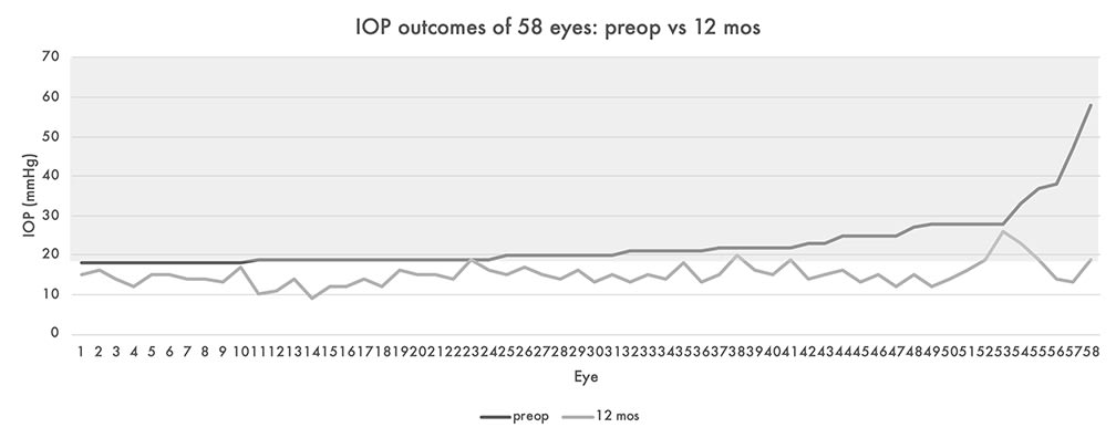 In the 58 eyes included in the final study cohort, mean IOP (mmHg) dropped from 22.9±7.03 mmHg to 15.0±2.9 mmHg (34% reduction) while mean number of medications dropped from 2.7±0.8 to 1.1±1.1 (58% reduction). Although mean IOP and medication reduction were already expected,13 what was remarkable was the consistency of these outcomes when examined on an eye-to-eye basis.