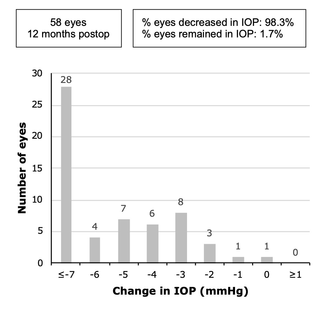 A consistent reduction in IOP was observed in the cohort, as 57 out of 58 eyes achieved a reduced IOP at 12 months postoperatively (Figure 1). One eye had no change in IOP but achieved a reduction in medications. Of the 57 eyes with reduced IOP, 44 eyes achieved a reduction in both IOP and medications, whereas the remaining 12 eyes achieved a reduction in IOP with the number of medications unchanged from baseline. These were classified as “success” (56 eyes, 88% of entire cohort). One eye out of the 57 reduced-IOP eyes had an increase in the number of medications; this was categorized as “ambiguous,” along with the eye that had no change in IOP but had reduced medications (2 eyes, 3% of entire cohort). No eyes showed an increase in IOP (Figure 2).