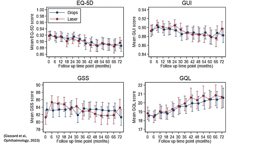 LiGHT was a randomized control trial conducted in the United Kingdom which included 718 treatment-naïve subjects newly diagnosed with ocular hypertension or primary open-angle glaucoma. (Subjects with advanced disease, angle-closure glaucoma, childhood glaucoma, or secondary glaucoma were excluded from the study.) Outcomes included health-related quality of life (Figure 1), cost effectiveness, and clinical efficacy.1