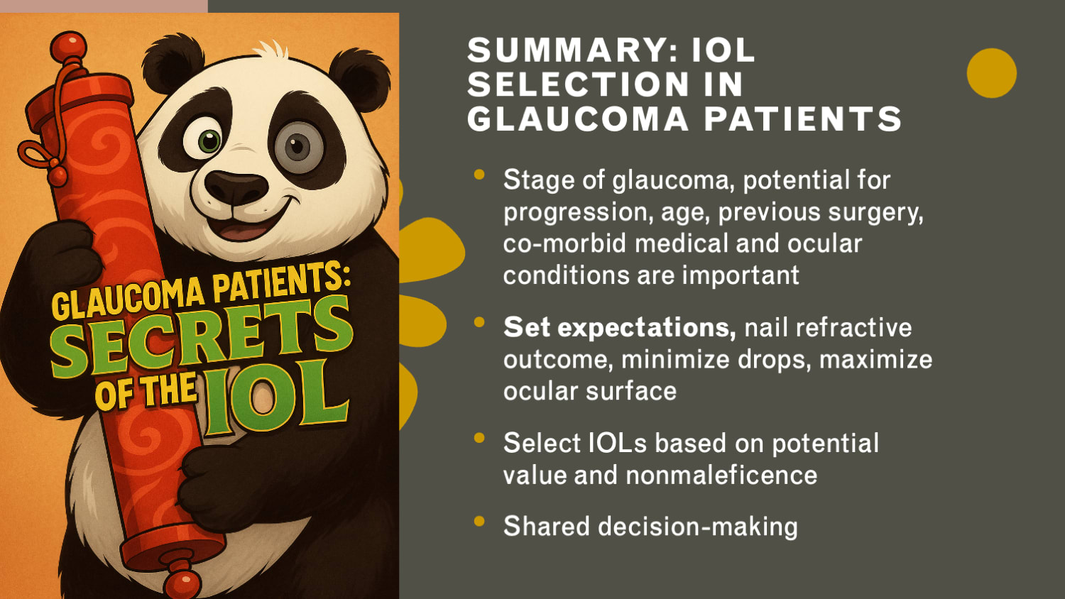 Figure 2. Key considerations for IOL selection in glaucoma patients include disease stage and progression risk, patient history and comorbidities, surgical planning priorities, and shared decision-making to maximize benefit while minimizing harm.