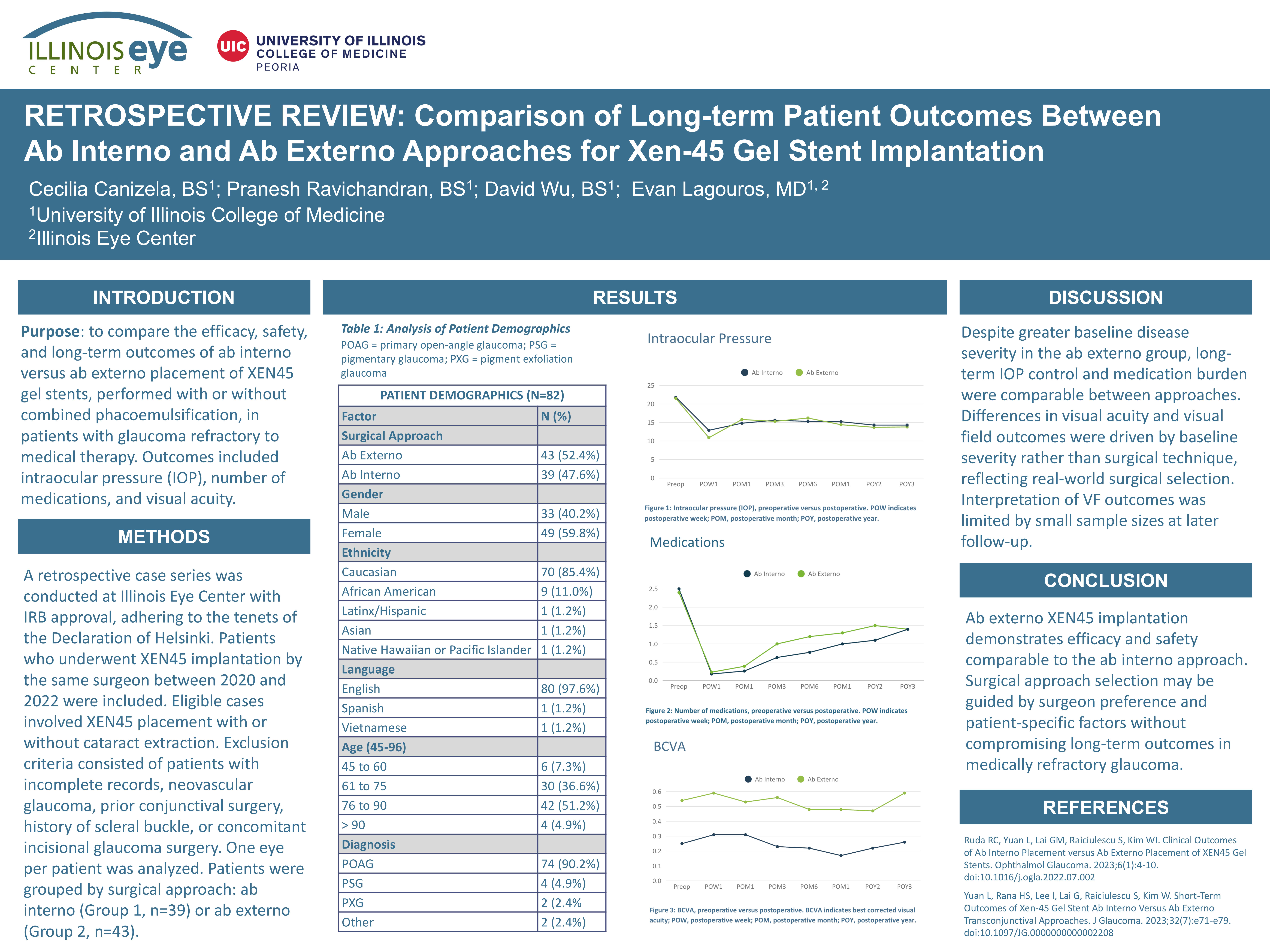 Here, we presented a poster on a retrospective review of the Xen gel stent (AbbVie), up to 3 years of follow-up. So we were looking at the long-term outcomes for patients, and what we found is that the ab interno and ab externo surgical approaches had equivalent outcomes. They were both successful at reducing number of medications and IOP, and [had] equivalent improvement in best-corrected visual acuity (BCVA).* It was important for us to take a look at the longer term, so our follow-up was up to 3 years.